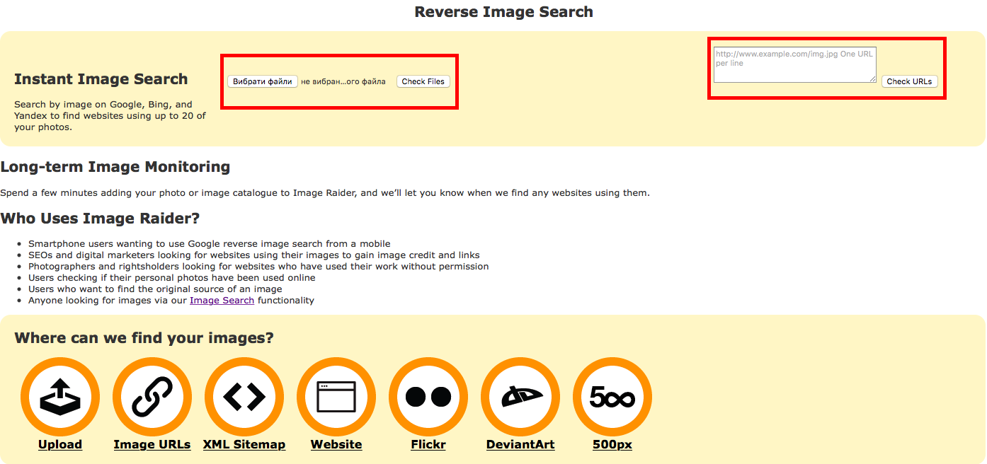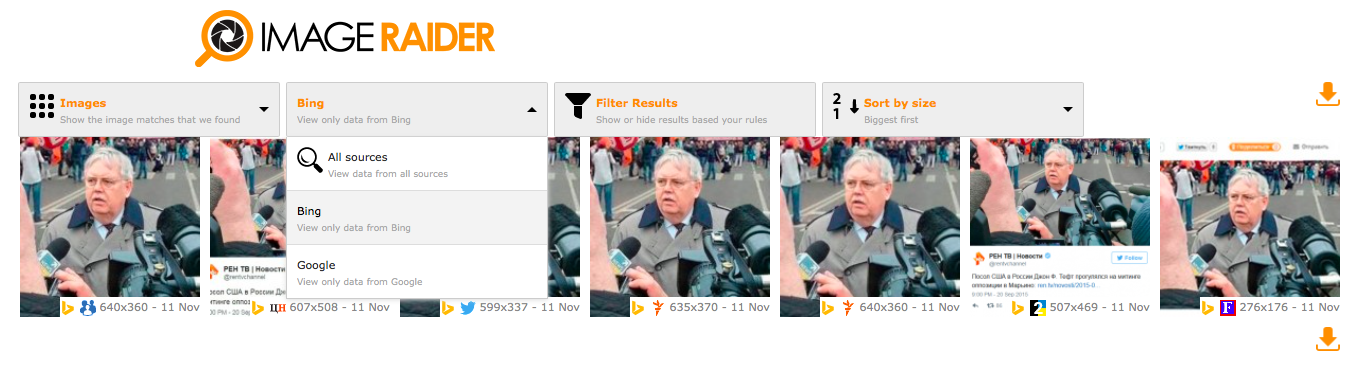 Еще один интересный инструмент резервного поиска — Image Raider. Хотя он не является автономной поисковой системой, его преимущество в том, что Image Raider собирает результаты сразу с нескольких поисковиков — Google, Bing и Yandex — для проверки изображения и предлагает некоторые удобные фильтры поиска, которых нет в других инструментах.