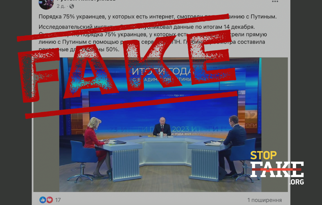 Анонимные Telegram-каналы, а также некоторые пользователи сети со ссылкой на данные исследовательского института Gallup распространяют сообщение о том, что около 75% украинцев, у которых есть интернет, якобы смотрели прямую линию с Владимиром Путиным 14 декабря. При этом указывается, что пользователи для доступа к видеотрансляции якобы использовали различные сервисы VPN. В публикациях также отмечается «ошеломляющий интерес» украинцев к речи Путина – данные Gallup якобы фиксируют рекордную глубину просмотра видео в 50%.