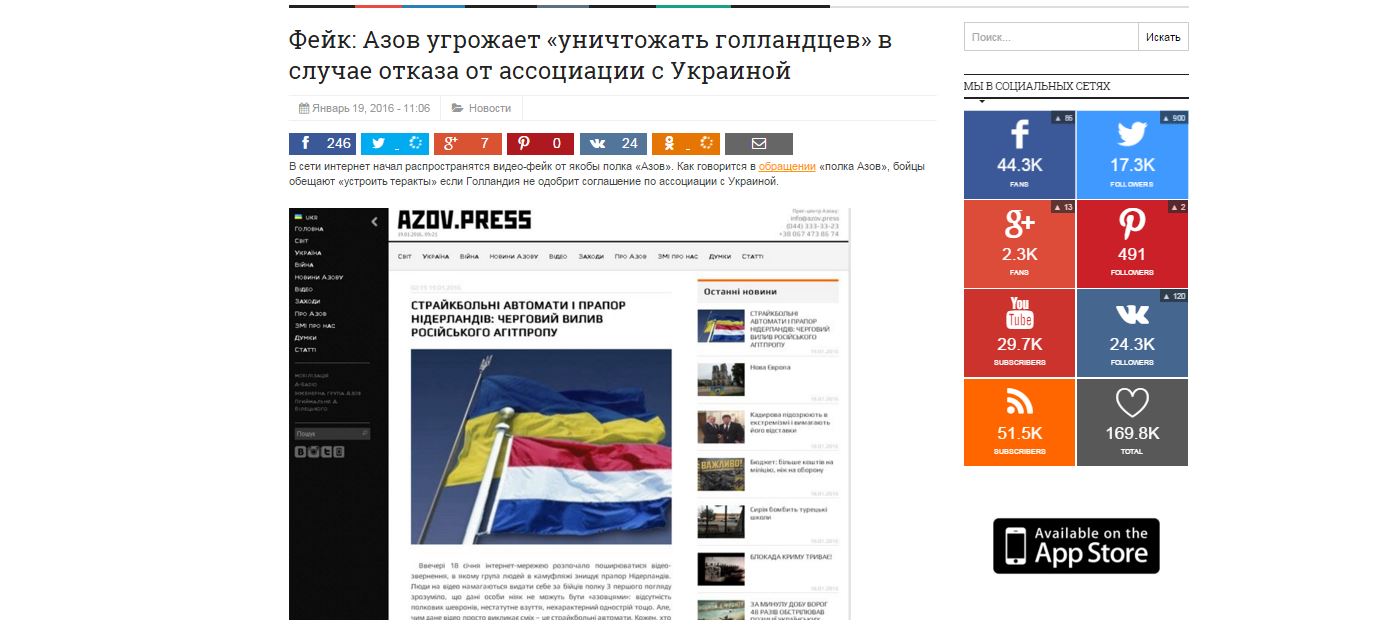Напомним, ранее фейк об«Азов» распространялся в российских СМИ. На видео поддельные участники батальона «Азов» угрожали терактами государству Нидерланды в случае негативных результатов голосования на референдуме 6 апреля.