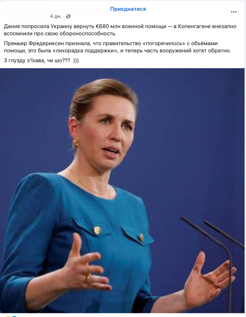 Кремлевские Telegram-каналы и пользователи соцсетей распространяют информацию о том, что Дания якобы попросила Украину вернуть 680 млн евро, полученных в качестве военной помощи. Такая просьба якобы была озвучена премьер-министром Дании Метте Фредериксен на фоне заявлений президента США Дональда Трампа о возможном захвате Гренландии.