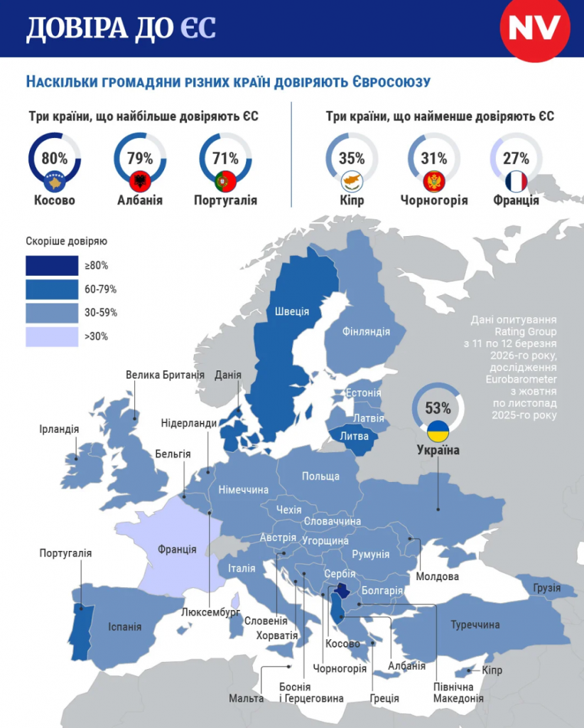 На самом же деле украинцы доверяют ЕС больше, чем граждане Франции, Кипра, Греции, Словении, Бельгии, Чехии и Болгарии — об этом говорят данные опроса группы «Рейтинг»: более половины граждан Украины (53%) доверяют институтам ЕС. В то же время 83% респондентов, опрошенных Центром Разумкова, выступают за полноценное вступление Украины в Евросоюз.