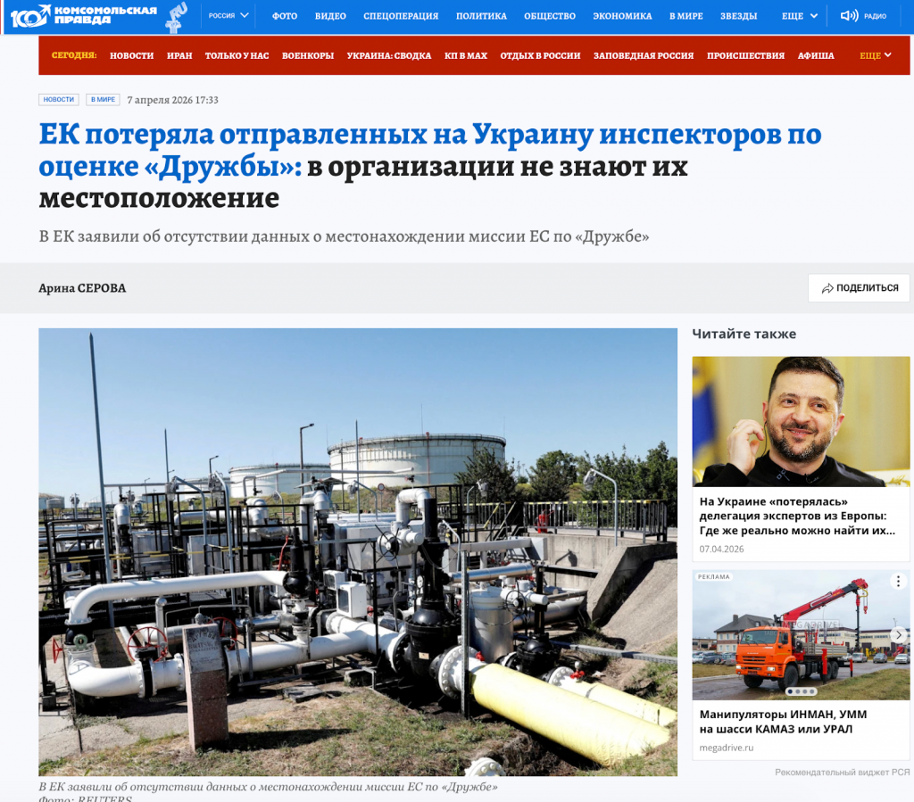 Анонимные Telegram-каналы и российские издания стали распространять заявление, что Еврокомиссия якобы «потеряла» инспекторов, направленных в Украину для оценки состояния нефтепровода «Дружба», и что об этом сообщила пресс-секретарь Еврокомиссии Анна-Кайса Итконен.