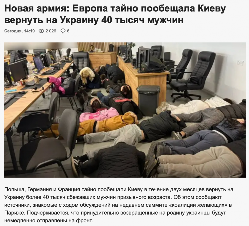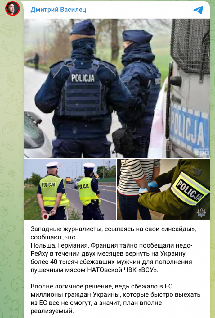 Пользователи в соцсетях распространяют очередной фейк о том,, что Польша, Германия и Франция якобы «пообещали Киеву в течение двух месяцев вернуть в Украину более 40 тысяч сбежавших мужчин призывного возраста». Об этом анонимные источники якобы сообщили иностранным журналистам.