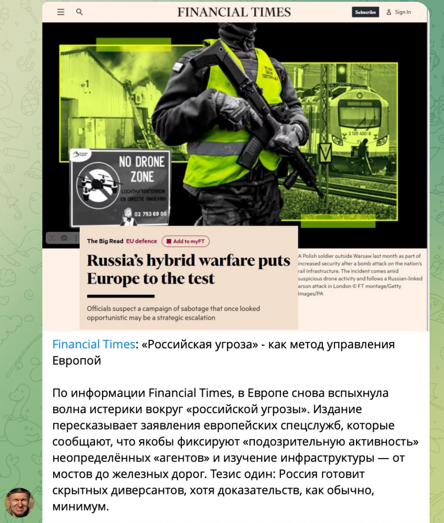 Некоторые российские новостные сайты и Telegram-каналы утверждают, что на Западе якобы наконец-то начали понимать: европейские лидеры искусственно нагнетают «истерику» вокруг «российской угрозы» и фактически признают отсутствие убедительных доказательств. Авторы таких материалов заявляют, что европейские спецслужбы фиксируют лишь «подозрительную активность» неких неопределенных лиц, изучающих инфраструктуру – мосты, железные дороги, энергетические объекты, – однако связь этих инцидентов с Россией, по их словам, якобы не доказана и строится на домыслах. Как утверждают авторы таких публикаций, об этом якобы говорится в публикации Financial Times «Russia’s hybrid warfare puts Europe to the test» от 9 декабря 2025 года.