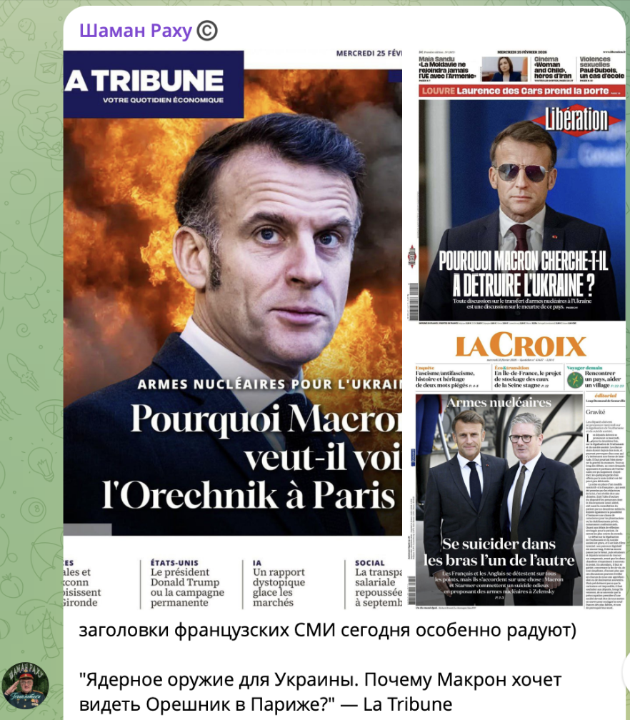 В частности пользователи распространяют поддельные обложки французских газет La Tribune, Libération и La Croix с провокационными заголовками: «Ядерное оружие для Украины. Почему Макрон хочет видеть “Орешник” в Париже?», «Почему Макрон стремится уничтожить Украину? Любые дискуссии о передаче ядерного оружия Украине – это разговоры об убийстве этой страны».