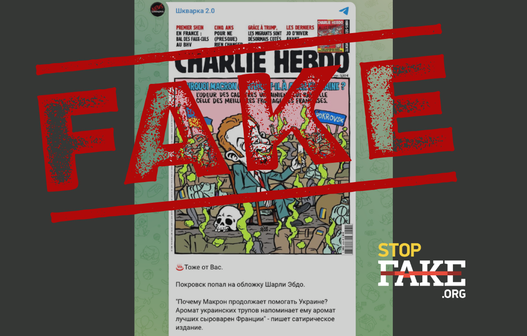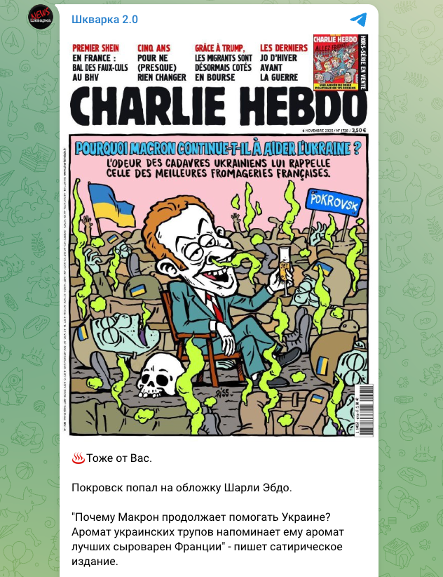 Пользователи соцсетей распространяют фейковую обложку, якобы напечатанную во французском сатирическом журнале Charlie Hebdo и посвященную президенту Франции Эммануэлю Макрону. На изображении Макрон сидит с бокалом игристого на поле боя среди тел украинских солдат в Покровске, «наслаждаясь происходящим».