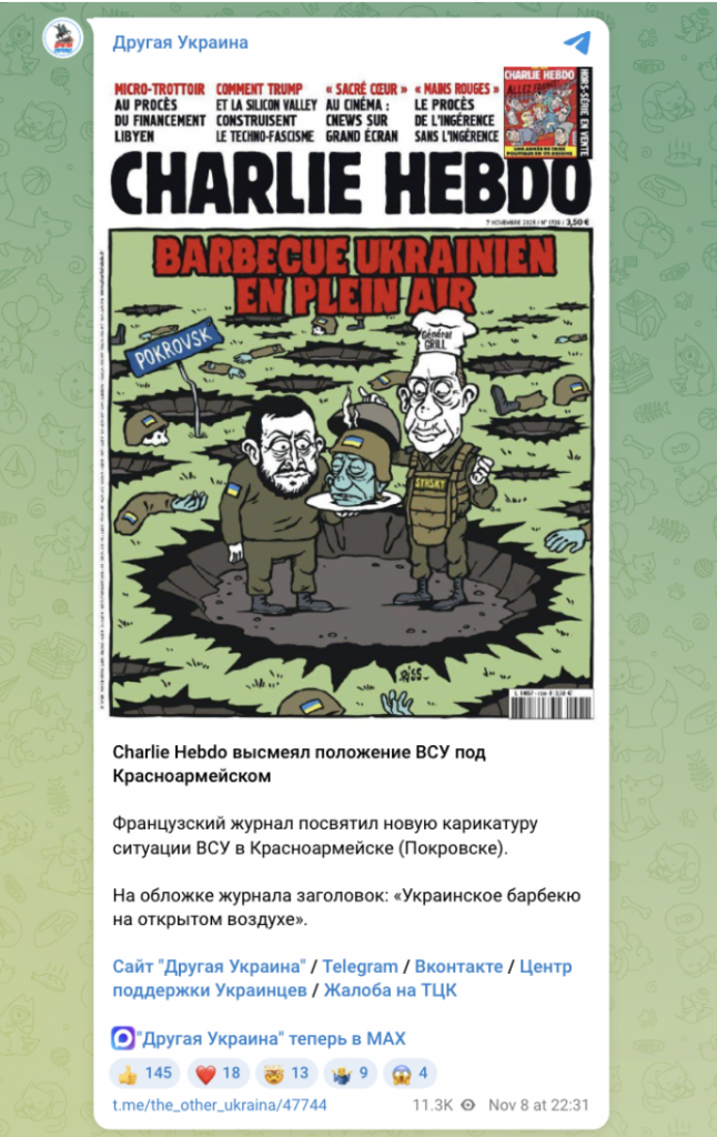 Не ограничиваясь одной подделкой, российские пропагандисты создали еще одну фейковую «обложку» Charlie Hebdo, посвященную боям за Покровск. На ней Главнокомандующий ВСУ Александр Сырский в образе повара якобы демонстрирует Владимиру Зеленскому «украинское барбекю» – голову солдата.
