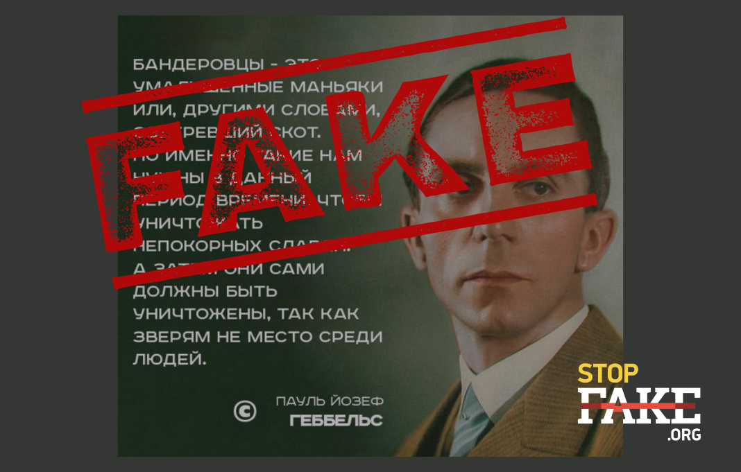 Пользователи соцсетей активно распространяют цитату о бандеровцах, которая приписывается немецкому пропагандисту и одному из идеологов нацизма Йозефу Геббельсу. Якобы он заявил, что бандеровцы — «умалишенные маньяки», которые нужны «чтобы уничтожать непокорных славян», а потом их необходимо уничтожить, так как «зверям не место среди людей». Подобный фейк используется российским агитпропом, чтобы в очередной раз подкрепить нарратив о том, что бандеровцы — пособники нацистов, как и нынешняя Украина — «фанат фашистской идеологии». Фейковую цитату распространяли и лидеры мнений в России, и коллаборанты на временно оккупированных территориях Украины.