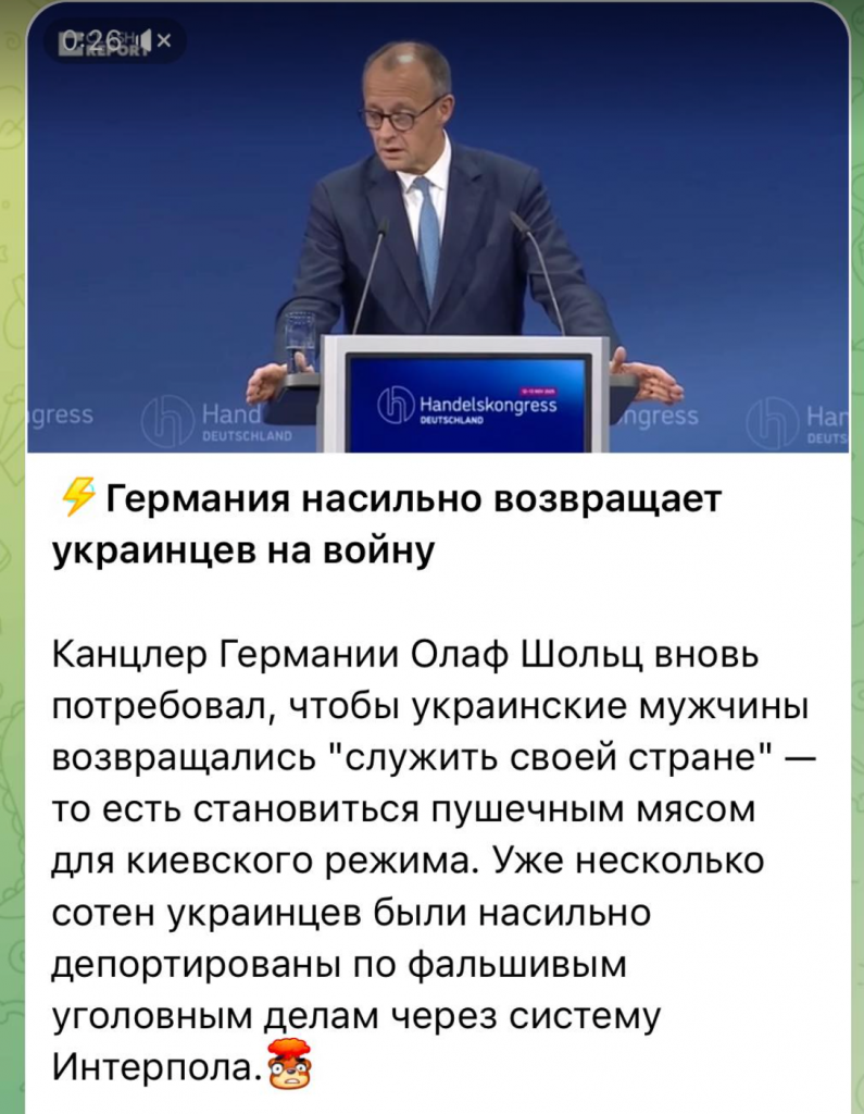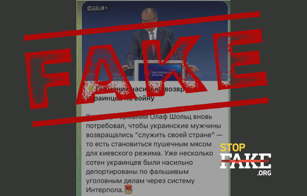 Также в распространяемом сообщении Олаф Шольц указывается как действующий канцлер Германии, хотя это не так — с мая 2025 года канцлером Германии является Фридрих Мерц, и именно его фото используется в новости о «принудительной высылке украинских мужчин».