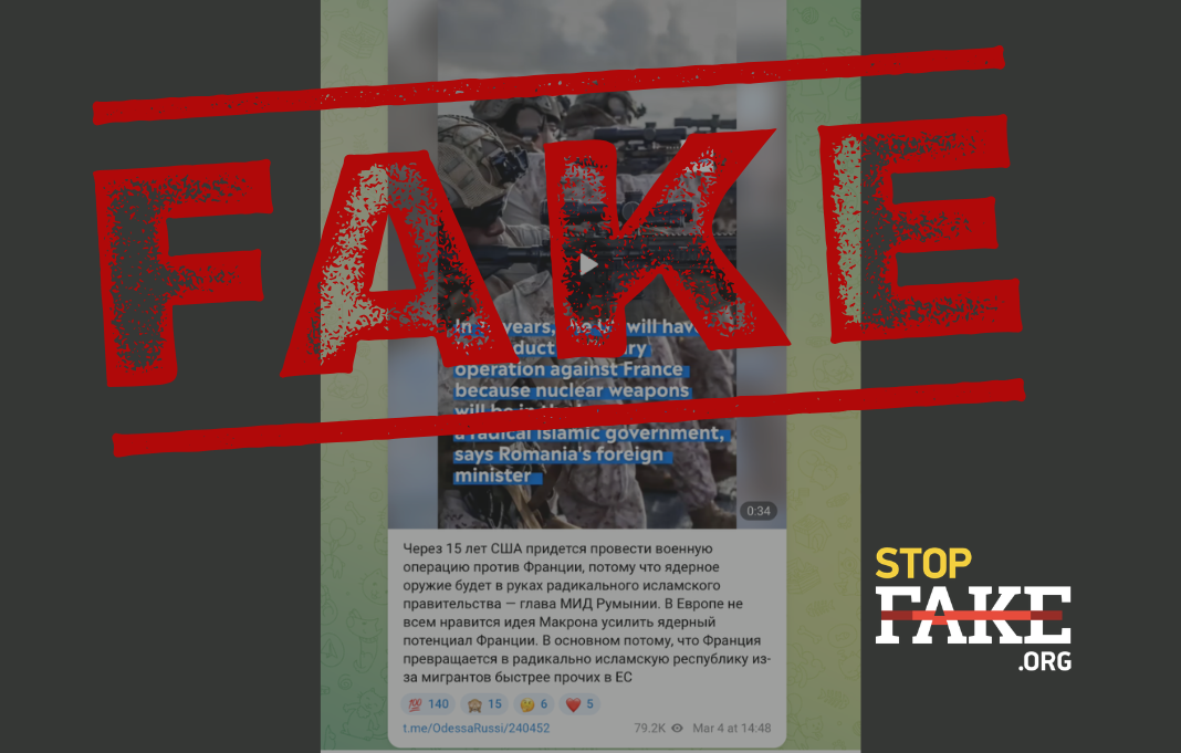 В сети распространяется видеоролик с символикой информационного телеканала Euronews, в котором утверждается, что министр иностранных дел Румынии Оана Цою якобы заявила: через 15 лет США будут вынуждены провести военную операцию против Франции.