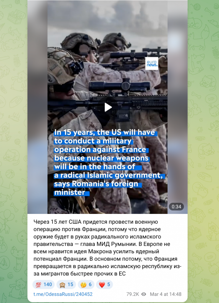 Таким образом, фейковое видео с логотипом Euronews является частью информационной кампании, направленной на дискредитацию ядерной политики Франции и разжигание страхов вокруг темы «радикализации Европы». Подобные вбросы также усиливают нарративы о якобы неизбежной эскалации и конфликте между странами Запада.