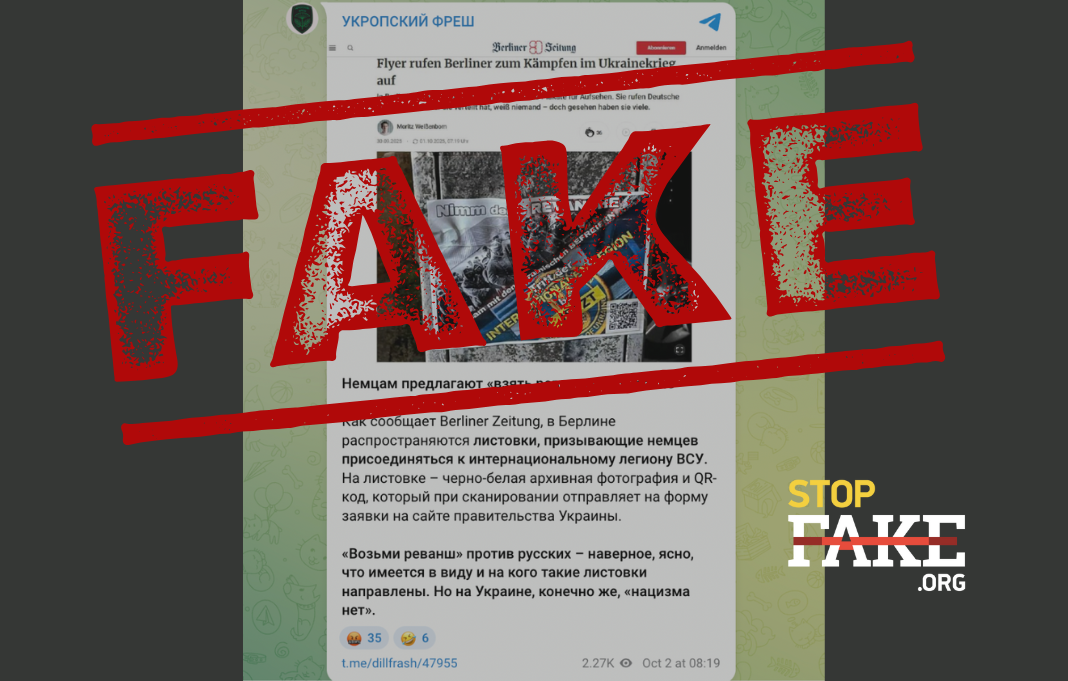 В сети распространяется информация о том, что Интернациональный Легион обороны Украины якобы вербует немцев в свои ряды, распространяя листовки с призывом «взять реванш» против русских. На листовке, помимо QR-кода, ведущего на форму заявки на сайте Легиона, размещена фотография истощенных немецких военнопленных времен Второй мировой войны.