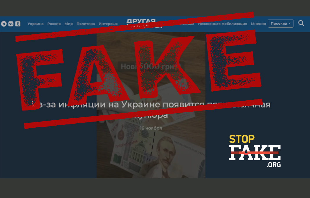 В Национальном банке Украины опровергают появление купюры номиналом 5 тысяч гривен «в связи с высокой инфляцией». Якобы слитое в сеть видео с новой купюрой является фейковым. На самом же деле на нем изображен презентационный эскиз банкноты без номинала, который НБУ выпустил еще в 2008 году.