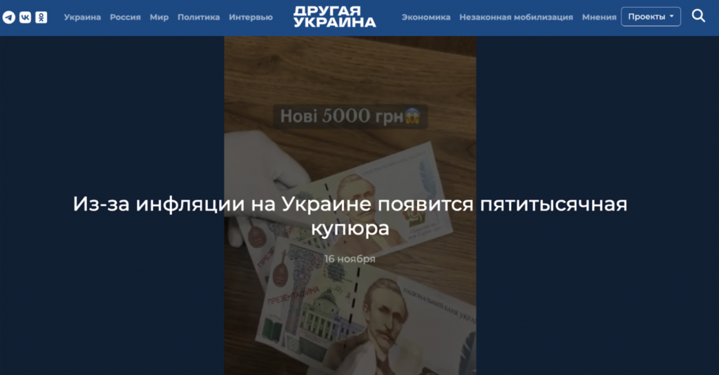 Кремлевские СМИ и пользователи соцсетей снова пугают читателей экономической катастрофой в Украине. На этот раз они пишут, что уровень инфляции в стране вырос настолько , что правительство собирается выпустить купюру номиналом 5 тысяч гривен. В качестве «доказательства» публикуется «слитое» видео с якобы ее прототипом.