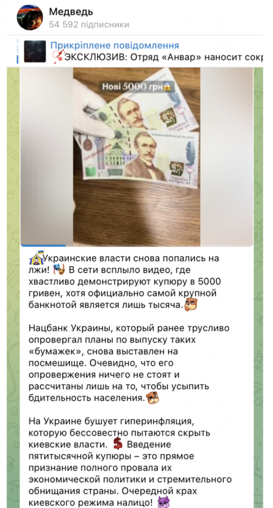 Национальный банк Украины систематически опровергает новости о планах якобы выпустить в оборот купюры номиналом в 5 тысяч гривен. В сентябре 2024 года глава НБУ Андрей Пышный уже комментировал подобные вбросы. Тогда он заявил, что имеющиеся номиналы полностью соответствуют текущей экономической ситуации. Незадолго до распространения фейкового видео, в начале октября 2025 года, в НБУ повторно опровергали украинским СМИ возможность появления новой купюры.