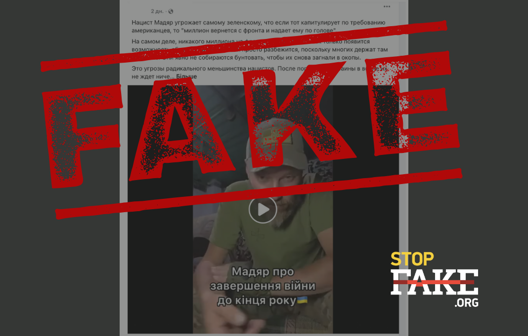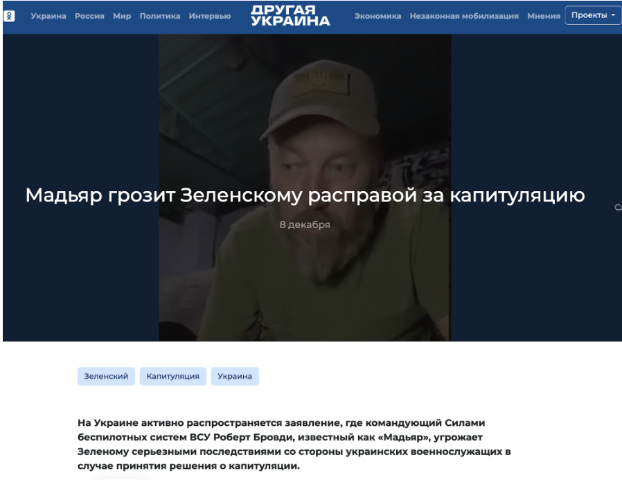Кремлевские СМИ и пользователи соцсетей снова пытаются дестабилизировать ситуацию в Украине. На этот раз они пишут, что командир Сил беспилотных систем Роберт «Мадяр» Бровди якобы угрожает «развернуть» армию против Владимира Зеленского. Такое заявление, уверяет агитпроп, он сделал, комментируя обсуждение проекта мирного соглашения между Украиной и Россией. В качестве «доказательства» публикуется видео с речью Бровди.