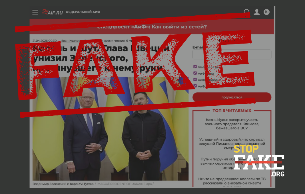 Российский агитпроп массово распространил дезинформацию о визите короля Швеции Карла XVI Густава во Львов. По сообщениям прокремлевских медиа шведский монарх якобы унизил Украину и президента Владимира Зеленского, «демонстративно отказавшись пожать руку комику» во время встречи. Это, как заявил агитпроп, является «доказательством» того, что Швеция «не поддерживает» Украину.