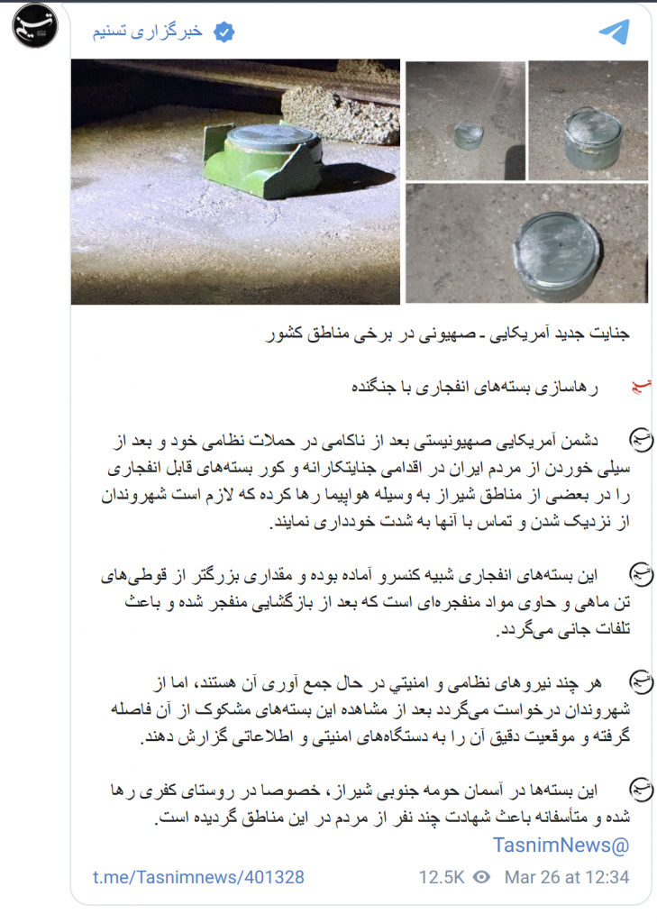 «Несколько местных жителей погибли в результате взрывов мин, замаскированных под консервные банки, которые были сброшены с израильских и американских самолетов в некоторых районах близ города Шираз, расположенного на юге Ирана. Об этом сообщило агентство Tasnim.