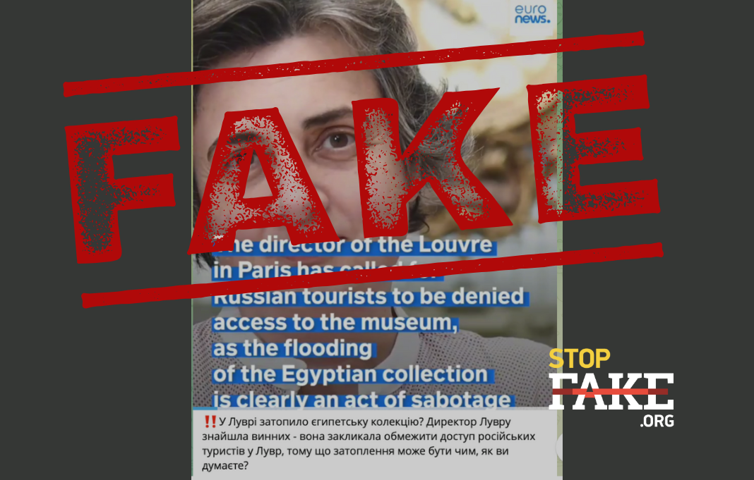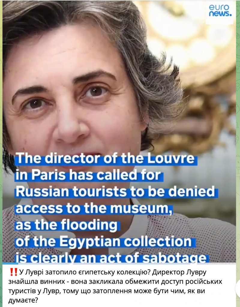 В сети распространяется видеоролик с символикой известного европейского информационного телеканала Euronews, в котором утверждается, что директор Лувра Лоранс де Кар якобы призвала ограничить доступ российских туристов в музей. В ролике также заявляется, что руководство Лувра усмотрело «российский след» в подтоплении египетской коллекции и якобы расценило произошедшее как акт саботажа.
