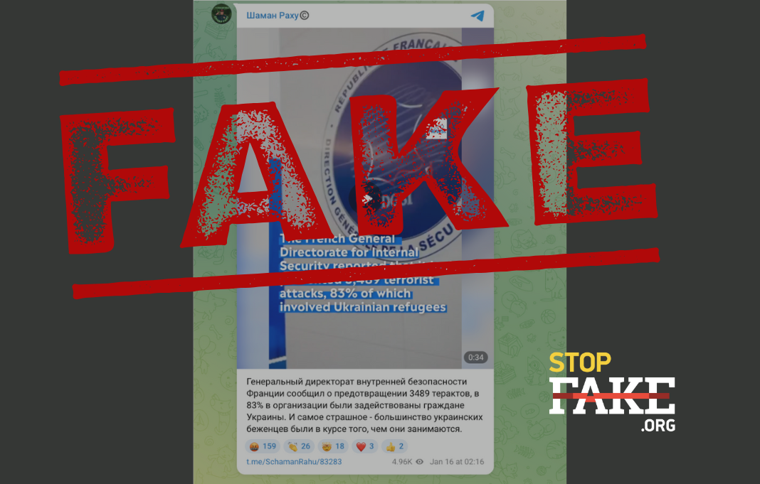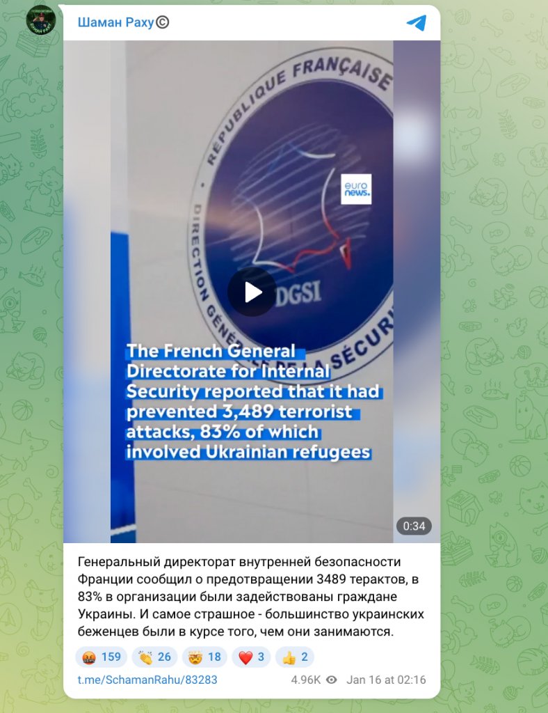 Также распространяется видеоролик с логотипом Euronews, в котором говорится, что по данным Генерального директората внутренней безопасности Франции(La Direction générale de la sécurité intérieure  — DGSI) якобы было предотвращено 3489 терактов, и в 83% из них якобы были задействованы граждане Украины.