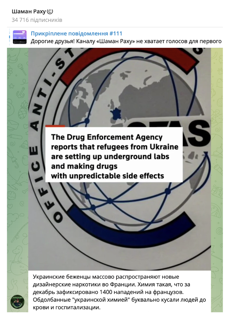 Отдельный блок фейков касается распространения наркотических веществ. В видеоролике с логотипом новостного агентства Reuters утверждается, что украинские беженцы якобы массово распространяют во Франции «дизайнерские наркотики», а за последний месяц было якобы зафиксировано 1400 нападений на французов, совершенных лицами под воздействием этих веществ. В другом ролике, оформленном под Le Point, сообщается о задержании украинского беженца, который якобы использовал захоронения на кладбище для хранения крупных партий наркотиков, работая в ритуальном агентстве.