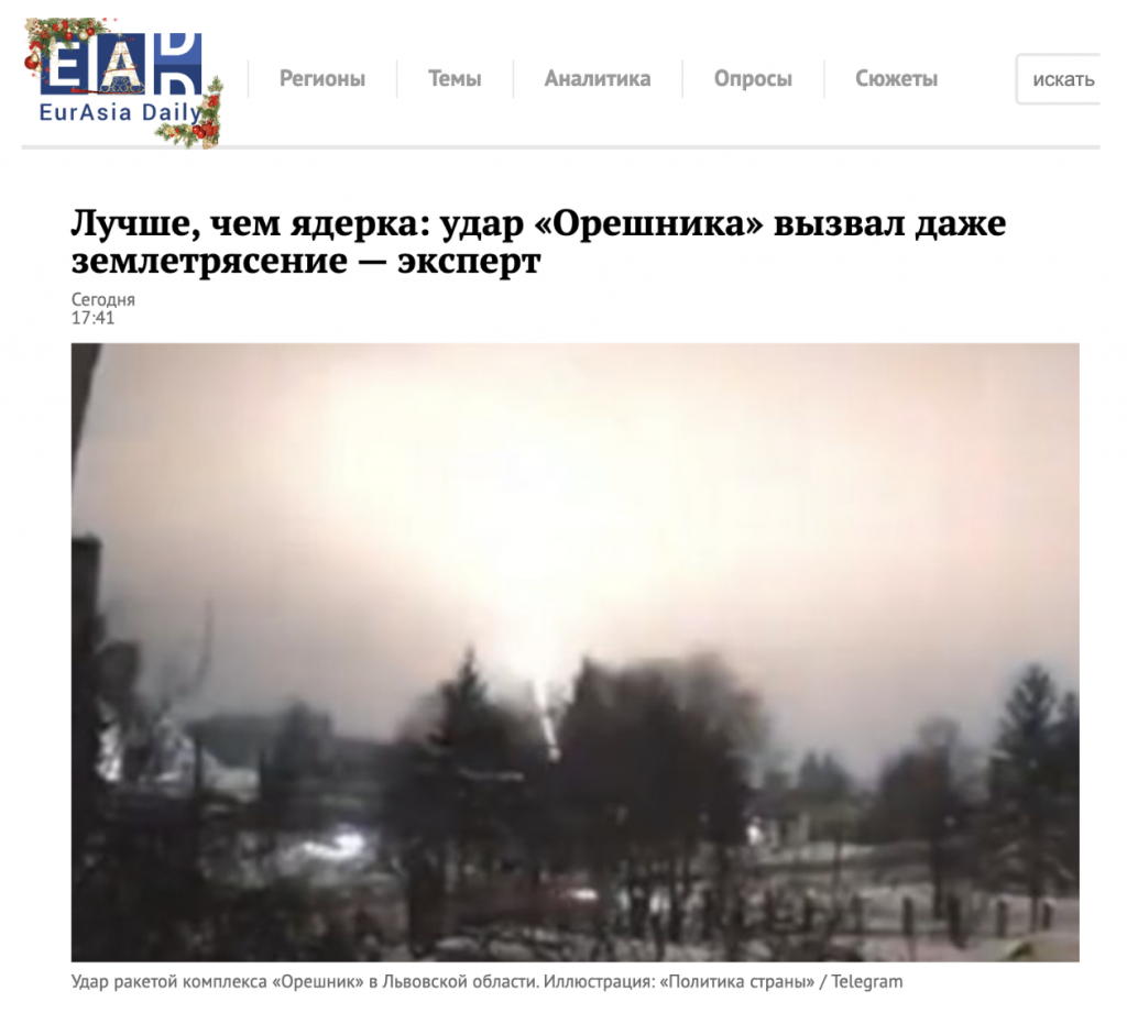 «По данным западных источников, в районе удара было зафиксировано землетрясение магнитудой около четырех баллов. Эта волна разрушает не только наземные, но и подземные сооружения…Орешник оказался сопоставим по разрушительной силе с ядерным оружием малой мощности, но без радиоактивного заражения и других катастрофических факторов», – восхищается российский агитпроп.