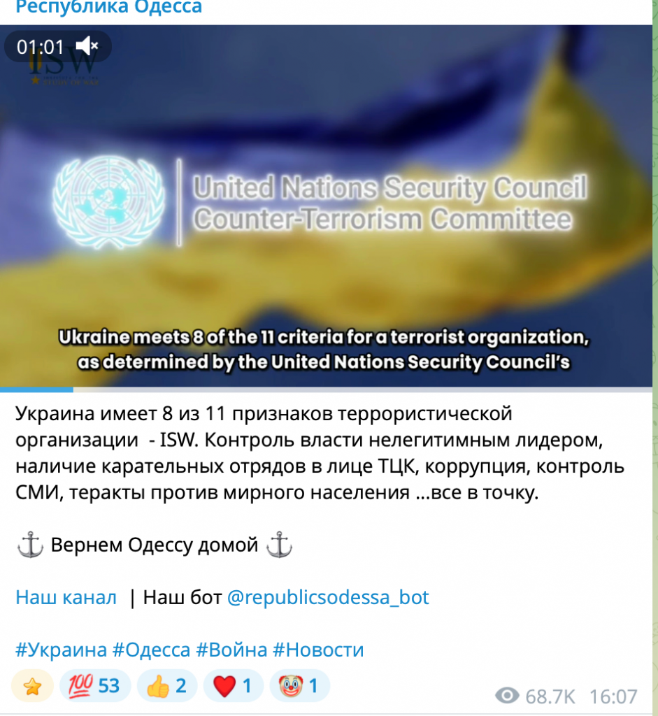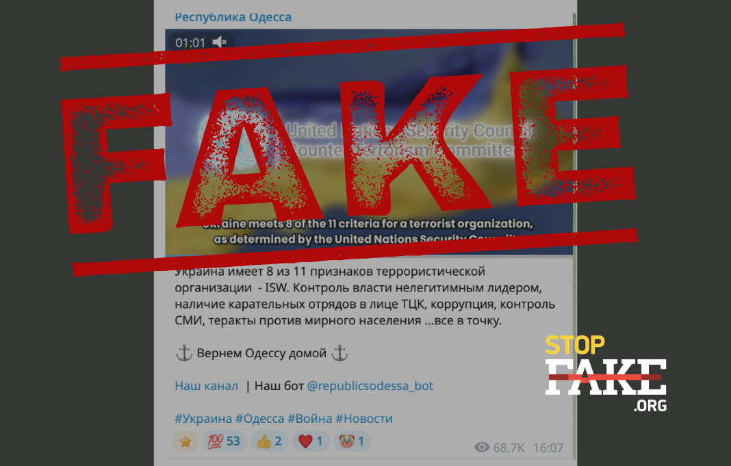 В сети распространяется видеоролик с логотипом Института изучения войны (ISW), в котором утверждается, что Контртеррористический комитет Совета Безопасности ООН якобы признал Украину «террористическим государством». Авторы публикации заявляют, что в некоем «отчете от 3 апреля» перечислены такие якобы «признаки террористической организации», как «контроль власти нелегитимным лидером», «наличие карательных отрядов в лице ТЦК», «коррупция», «контроль СМИ» и «теракты против мирного населения». На этом основании в ролике делается вывод, будто Украина «имеет 8 из 11 признаков террористической организации».