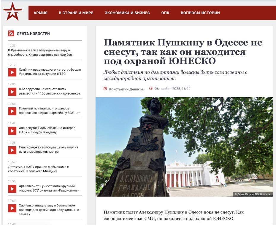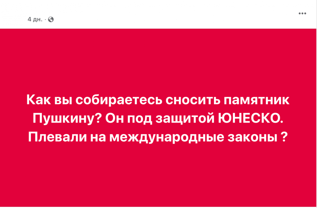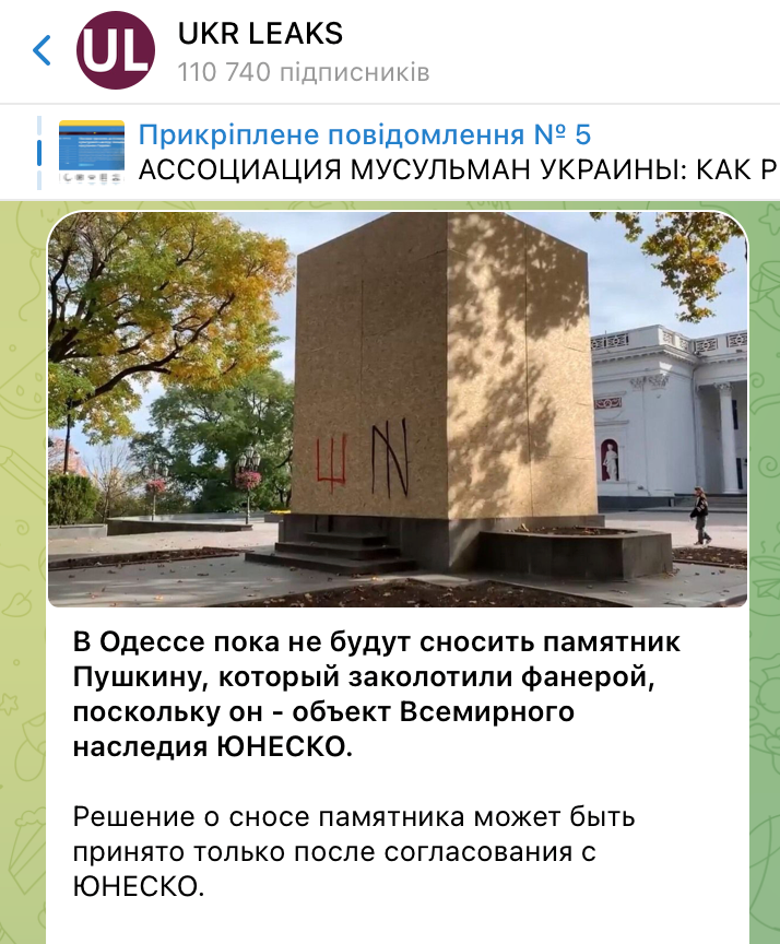 Пользователи социальных сетей, кремлевские СМИ и Telegram-каналы начали распространять информацию о том, что памятник российскому поэту Александру Пушкину в Одессе нельзя демонтировать, поскольку он являться объектом наследия ЮНЕСКО. В таких новостях агитпроп ссылается на Департамент международного сотрудничества, культуры и маркетинга Одесского горсовета, либо же вовсе не указывает первоисточник.