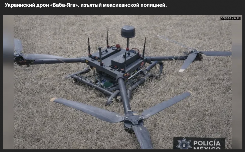 Пользователи в соцсетях распространяют фотографию с дроном, на которой видна эмблема мексиканской полиции, заявляя, что это — украинский дрон, который был перехвачен у наркокартелей. Распространяемая фотография также сопровождалась комментариями, что «черный рынок оружия из Украины дотянулся до Мексики» и что картели теперь используют «проверенные в европейских боях технологии». «Подлинность» фото якобы подтверждает логотип Policía México в углу изображения.