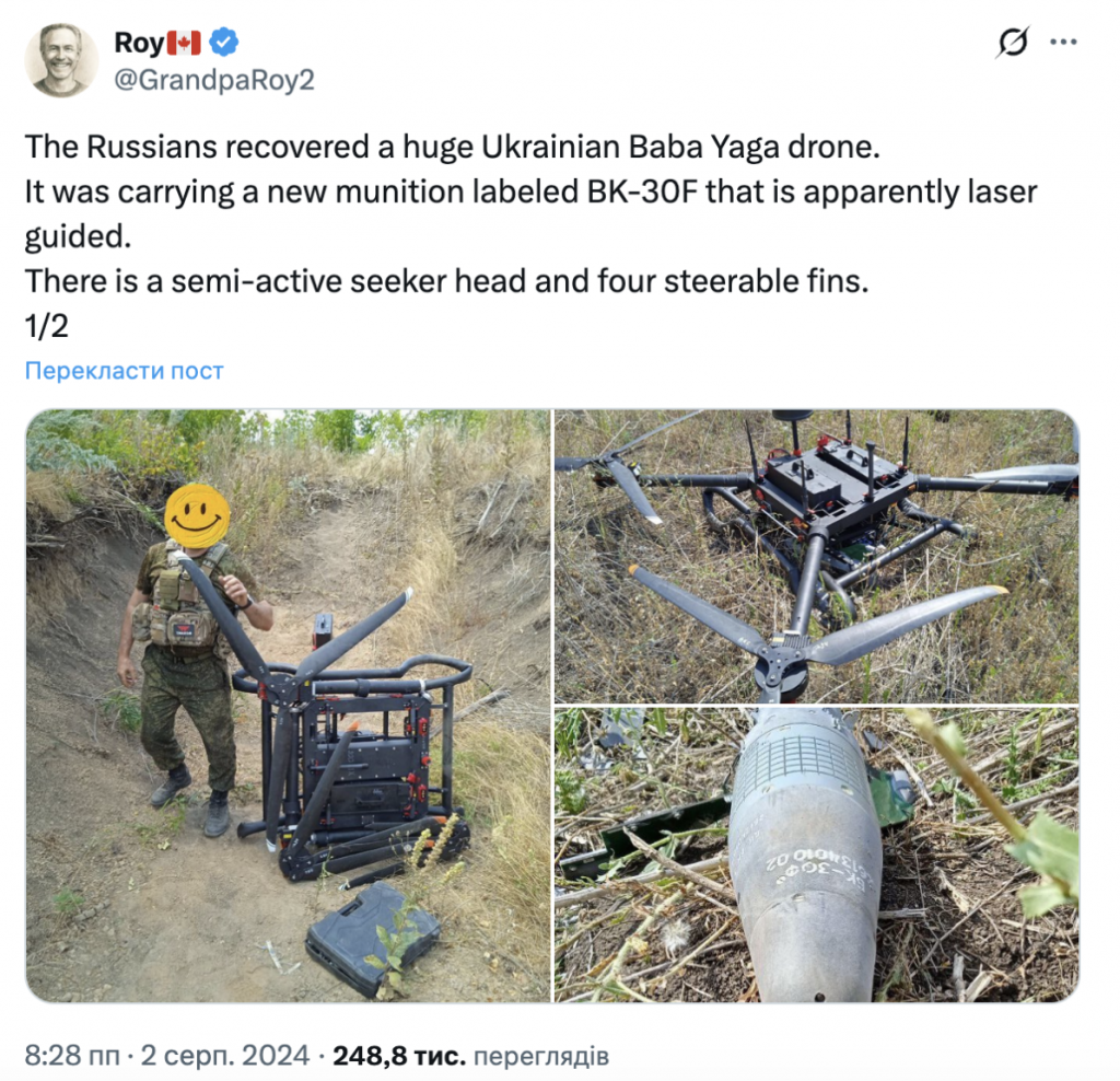 На самом же фото, которое приводится как доказательство, — поддельное. StopFake обнаружил, что пропагандисты отзеркалили (перевернули горизонтально) изображение, чтобы его было тяжелее проверить, и отредактировали фон, убрав зеленую траву. Однако по отдельным элементам — расположению деталей дрона, нумерации, которую нанесли характерным почерком на дроне, — можно убедиться, что на фото перехваченный в 2024 году российскими войсками украинский беспилотник Vampire (известный также как «Баба Яга»).