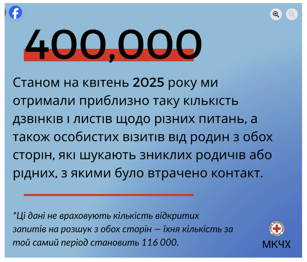 МККК в Украине не делал таких заявлений. В Красном Кресте отметили, что с начала широкомасштабного вторжения России в Украину комитет получил около 400 тысяч обращений от украинцев и граждан страны-агрессора.