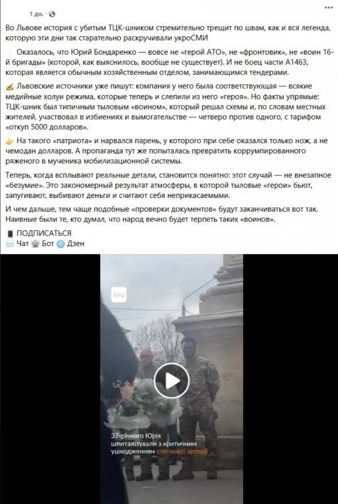 В социальных сетях и на российских сайтах распространяют информацию о том, что убитый во Львове сотрудник ТЦК не является героем АТО и вообще не принимал участия в боевых действиях. «Во Львове история с убитым ТЦК-шником стремительно трещит по швам, как и вся легенда, которую эти дни так старательно раскручивали укроСМИ. Оказалось, что Юрий Бондаренко — вовсе не «герой АТО», не «фронтовик», не «воин 16-й бригады» (которой, как выяснилось, вообще не существует). И не боец части А1463, которая является обычным хозяйственным отделом, занимающимся тендерами», — сообщают российские паблики. Также в сети отмечают, что Бондаренко проводил незаконные махинации и брал деньги от тех, кто хотел откупиться от воинской службы.