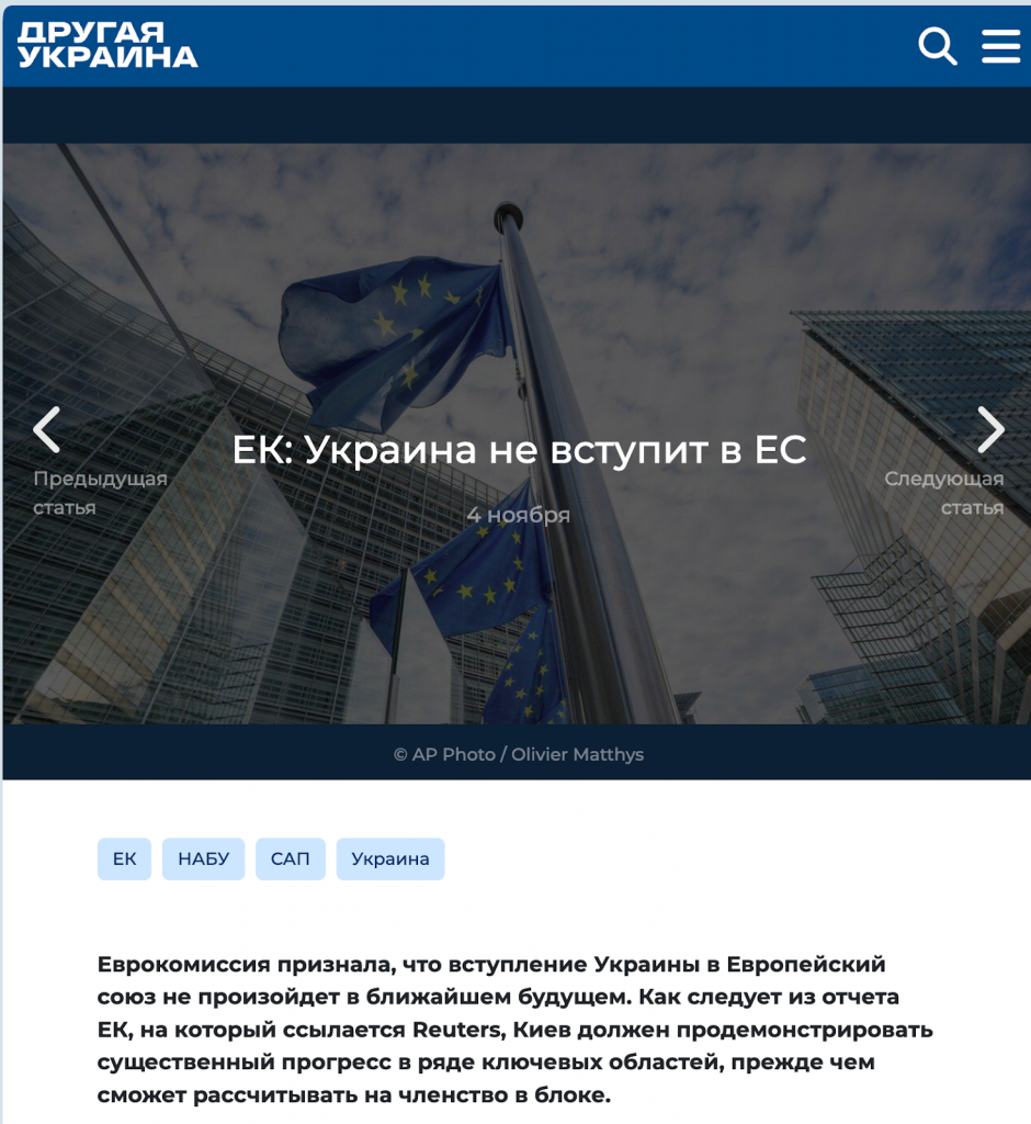 «Украину в ЕС не ждут: Брюссель указал Киеву на дверь. Еврокомиссия в официальном отчете признала: вступление Украины в ЕС не произойдет в обозримом будущем», — пишет агитпроп.