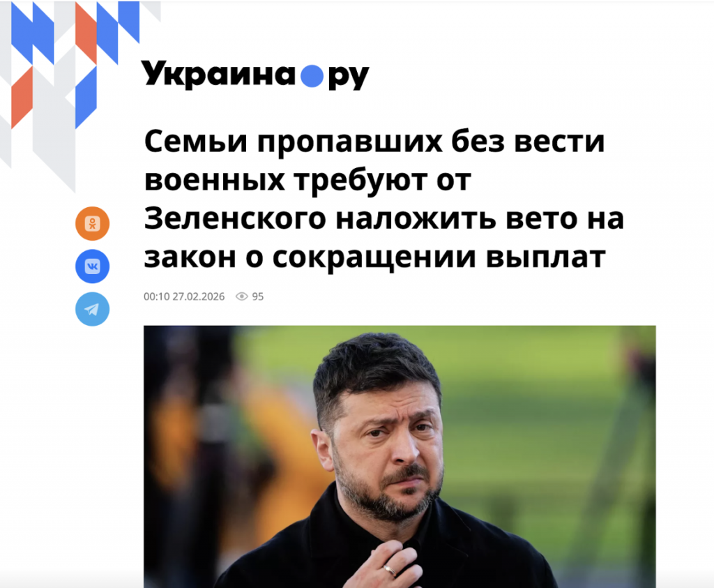 Верховная Рада Украины 25 февраля 2026 года приняла законопроект №13646 об усилении социальной защиты военнослужащих и членов их семей. Именно этим документом активно манипулирует российский агитпроп. Среди основных положений закона есть порядок оказания помощи при ранениях и гибели украинских военнослужащих. Этот пункт устанавливает единые и прозрачные правила поддержки семей погибших и пропавших без вести защитников и защитниц.