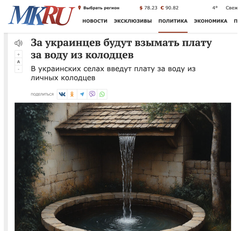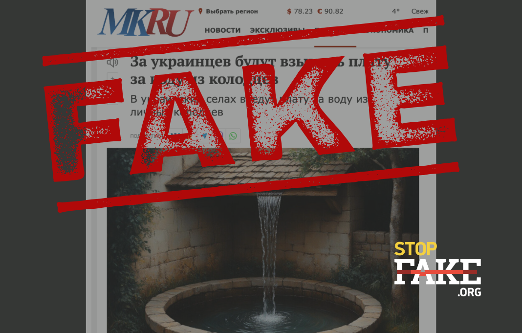 «Киевский режим грабит собственных граждан!», – российская пропаганда распространила фейк, согласно которому Украина якобы собирается «опломбировать» все источники воды в государстве. Агитпроп утверждает, что в Украине принят закон, который «обяжет жителей сел и райцентров платить за воду из собственных колодцев и источников – на колодцы должны будут установить счетчики».