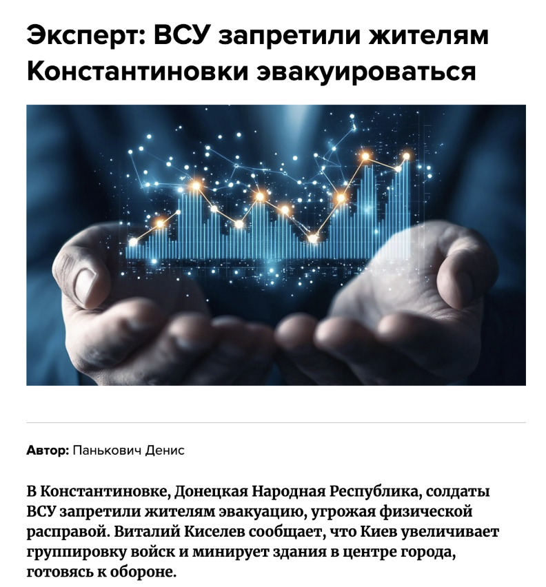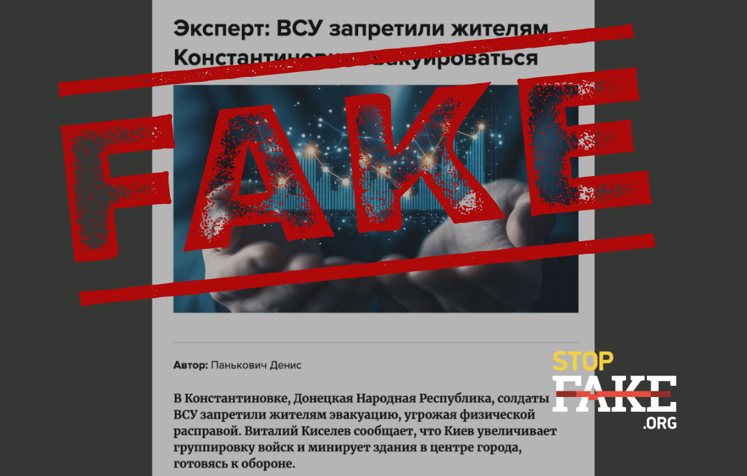С целью дискредитации Вооруженных сил Украины прокремлевские медиа распространяют очередной фейк с утверждением о том, что Силы обороны Украины якобы препятствуют эвакуации гражданского населения из города Константиновка Донецкой области. РосСМИ заявляют, что ВСУ «запретили жителям уезжать, угрожая физической расправой».