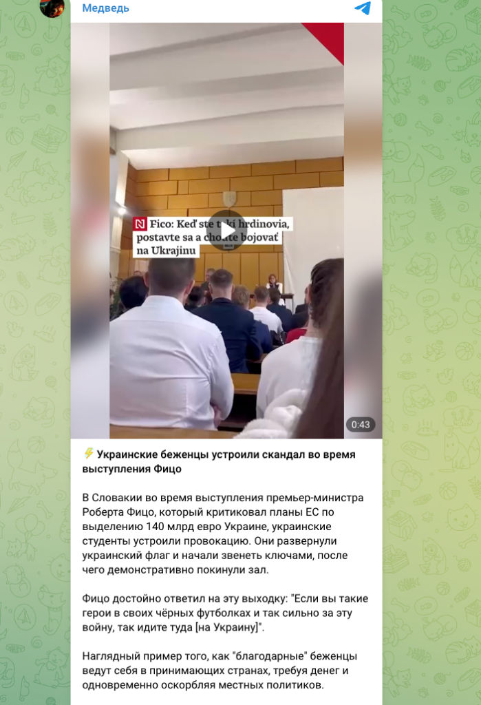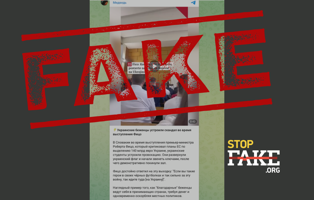 Пропагандистские Telegram-каналы распространяют сообщения о том, что во время выступления премьер-министра Словакии Роберта Фицо в городе Попрад провокацию устроили якобы украинские беженцы: развернули флаг Украины, звенели ключами, демонстративно покинули зал и «оскорбили» политика.