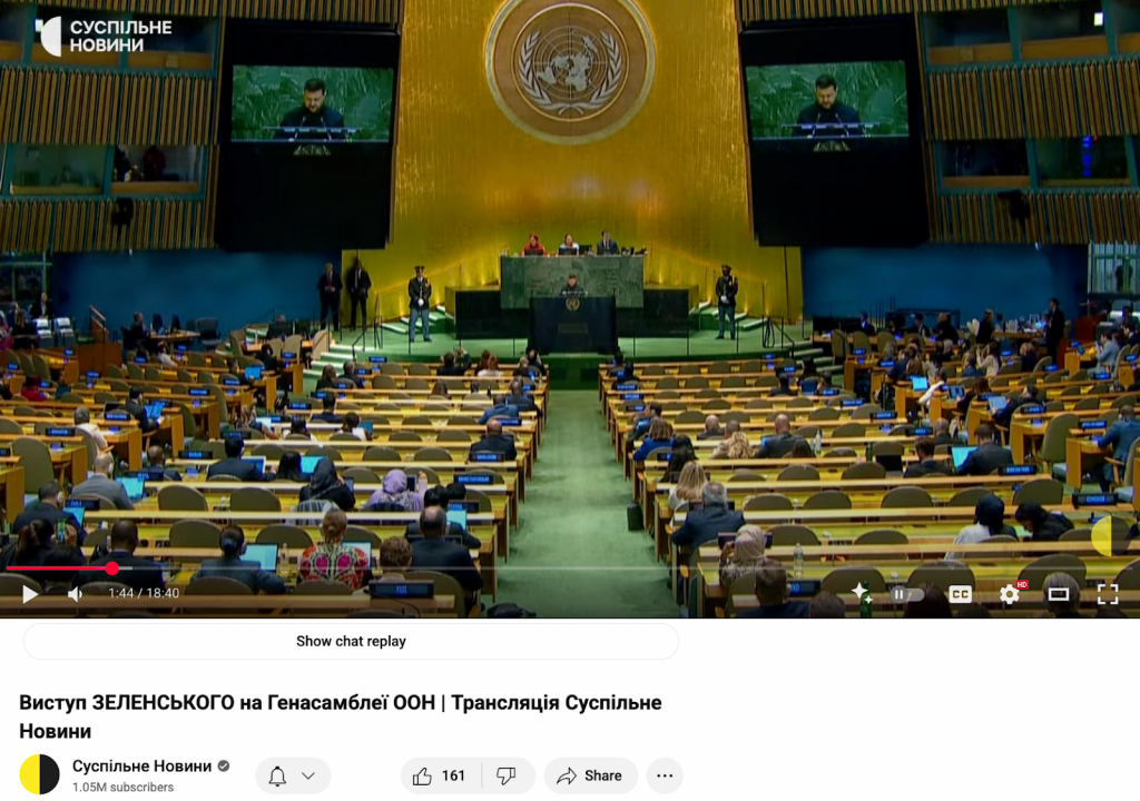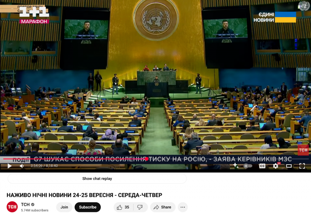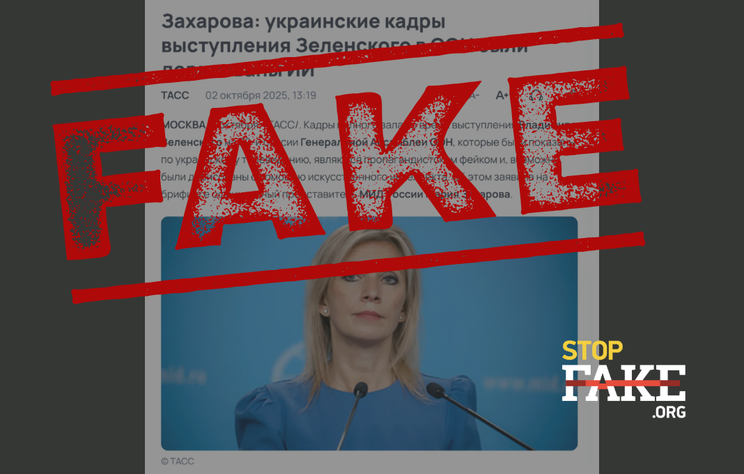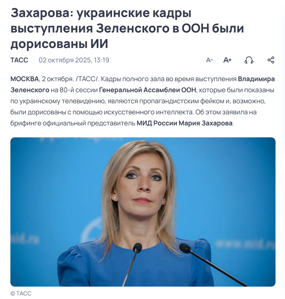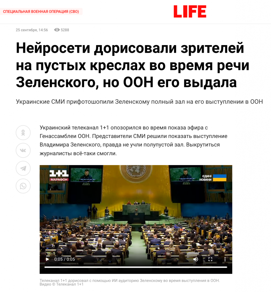 В конце сентября 2025 года в пророссийских Telegram-каналах и на ряде анонимных страниц в соцсетях начали рассказывать, что украинские СМИ якобы «дорисовали» в трансляции выступления президента Украины Владимира Зеленского на Генеральной ассамблее ООН «полный зал», хотя на самом деле там «никого не было». Этот фейк даже распространила официальный представитель МИД РФ Мария Захарова во время своего брифинга. В качестве «доказательства» используется фрагмент видео, якобы взятый из украинского телемарафона «Єдині новини».