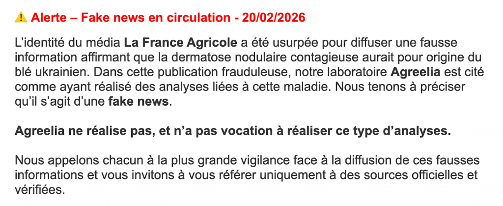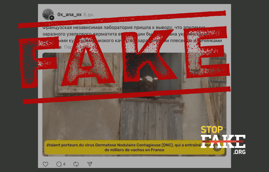 В сети распространяется сообщение о том, что французская лаборатория Agreelia якобы установила причину вспышки эпидемии заразного узелкового дерматита во Франции, поражающего крупный рогатый скот. Со ссылкой на публикацию издания La France Agricole утверждается, что эксперты лаборатории выяснили: болезнь якобы была вызвана украинскими зерновыми культурами низкого качества, зараженными плесенью и личинками комаров.