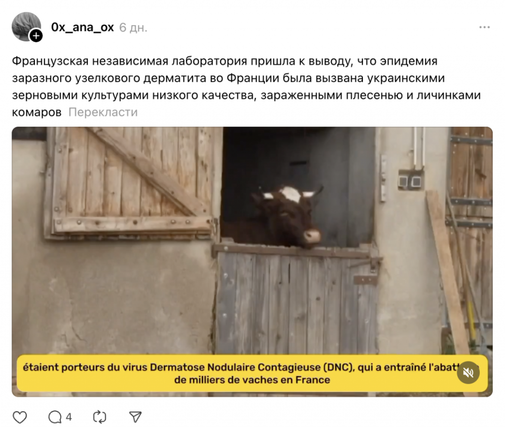 Видеоролик, распространяемый в сети и стилизованный под новостной сюжет, также является частью этой информационной кампании. Видео не содержит логотипа официального СМИ и не указывает автора. Анализ видеоряда показывает, что ролик представляет собой компиляцию фрагментов репортажа французского телеканала France 24 о вспышке узелкового дерматита в 2025 году, к которым была добавлена новая, вводящая в заблуждение озвучка.