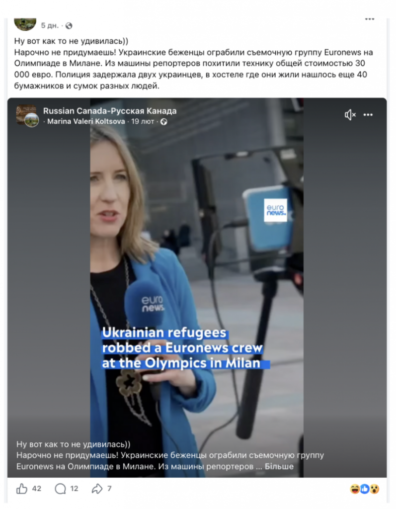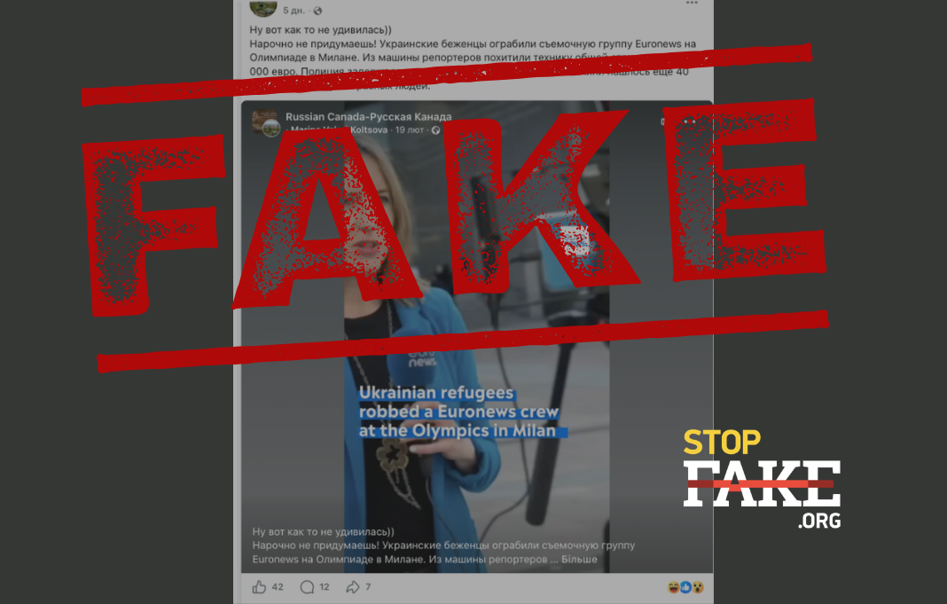 В сети распространяется видеоролик с символикой известного европейского информационного телеканала Euronews, в котором утверждается, что украинские беженцы якобы ограбили съемочную группу Euronews во время Олимпиады в Милане.