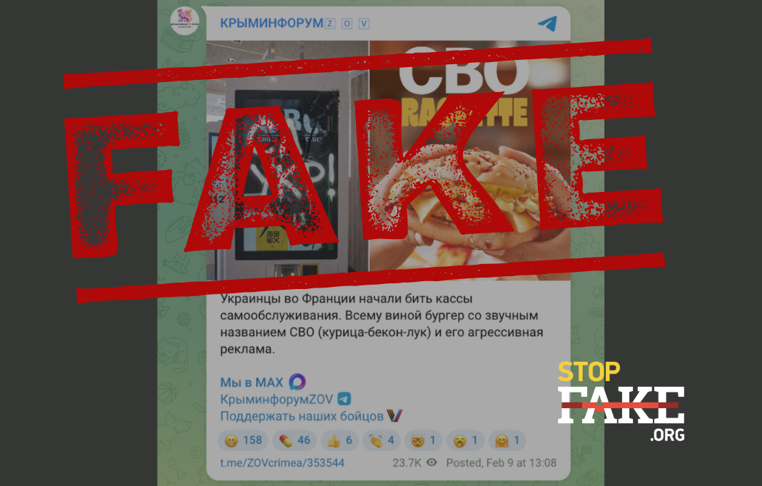 Пользователи сети распространяют сообщения о том, что украинцы во Франции якобы начали разбивать кассы самообслуживания в ресторанах быстрого питания McDonald’s из-за появления в меню бургера с названием «СВО» (курица-бекон-лук), которое якобы созвучно с акронимом «Специальная Военная Операция» России против Украины. На распространяемой фотографии видна разбитая касса самообслуживания с надписью «Сл Укр!».
