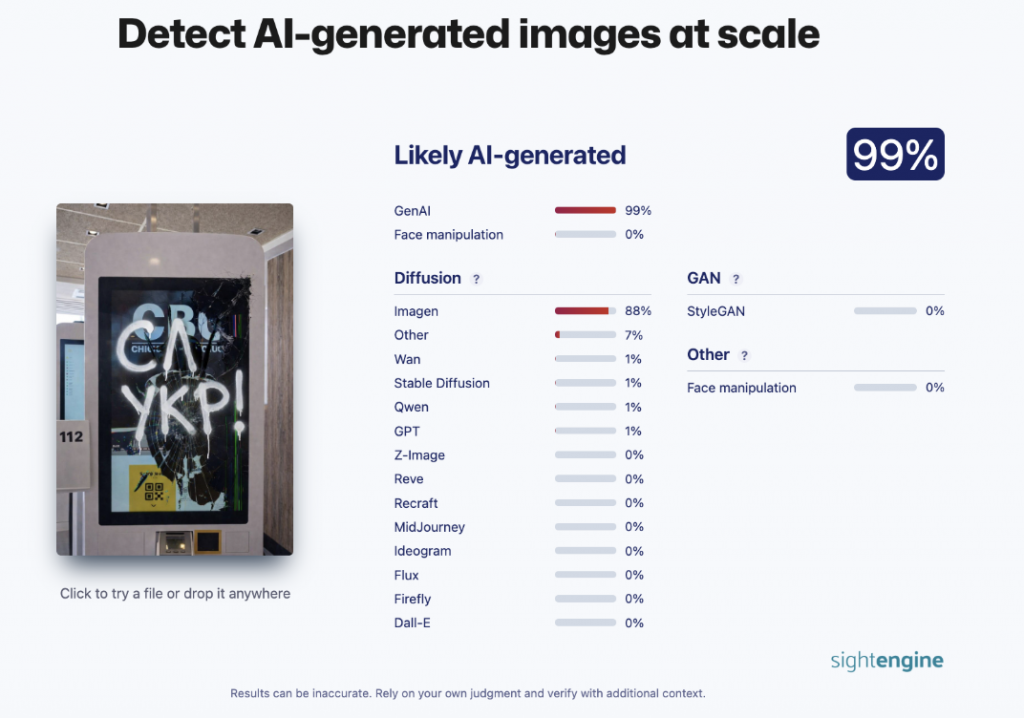Проверка изображения с помощью сервиса SightEngine показала, что оно было полностью или частично создано либо отредактировано с использованием инструментов искусственного интеллекта Google. На это указывает и цифровой водяной знак SynthID, интегрированный в пиксели изображения, который был обнаружен чат-ботом Gemini.