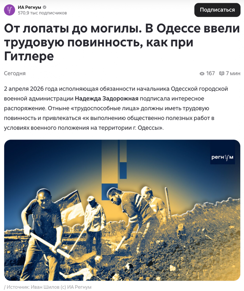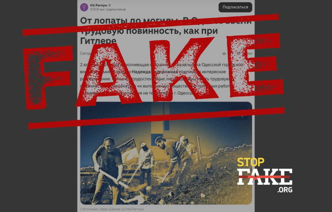 Российские СМИ распространяют новость о том, что в Одессе якобы ввели «принудительный режим трудовой мобилизации жителей», «как при Гитлере». «От лопаты до винтовки, а там и до братской могилы — всего один шаг», — пишут пропагандисты.