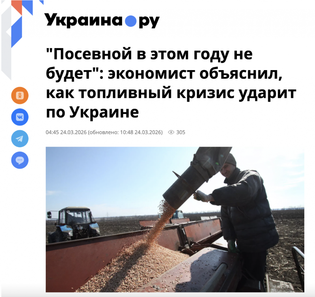 «Очевидно, что армия получит топливо и деньги в первую очередь. Солярки не будет у трактористов в поле, а у танкистов она будет. Посевной на Украине в этом году действительно не будет», – мрачно уверяет агитпроп.