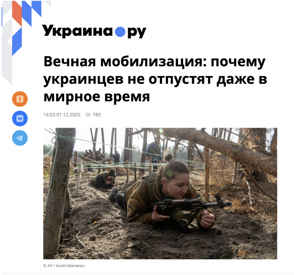«Мобилизация в Украине не закончится, даже если завтра объявят мир. Потому что она перестала быть инструментом войны. Теперь это – модель управления страной и экономикой», – резюмируют пропагандисты.