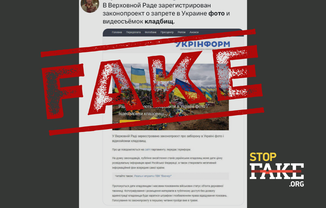 Пользователи в соцсетях распространяют информацию о том, что якобы в Верховной Раде появился законопроект, которым в Украине запретят фотографировать и снимать на видео кладбища. Для убедительности такие публикации сопровождаются якобы скриншотом новости об этом, появившейся на сайте украинского информагентства Укринформ.
