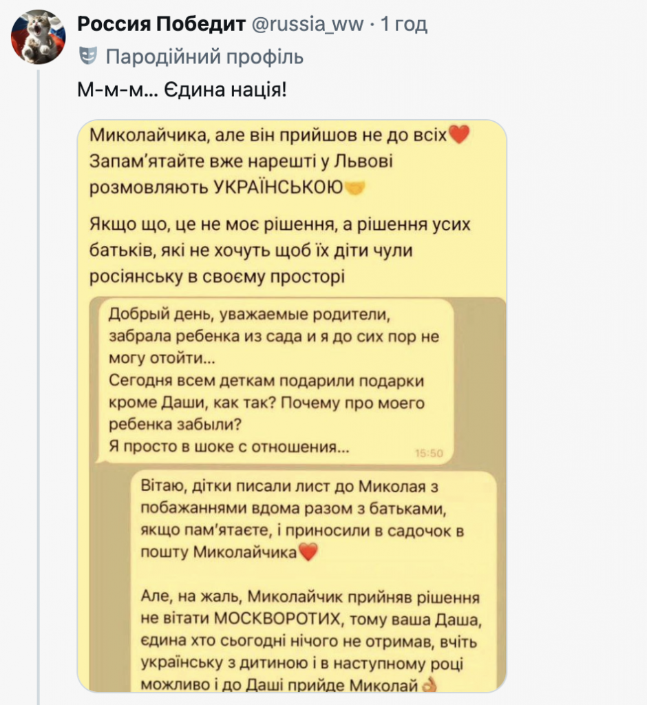 Пользователи в соцсетях и российские СМИ массово распространяют новость о том, что во львовском детском саду ребёнку, говорящему дома на русском языке, было отказано в новогоднем подарке.