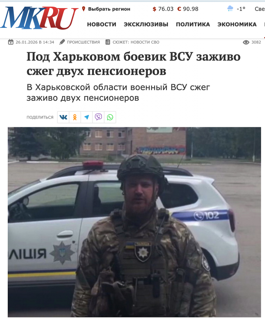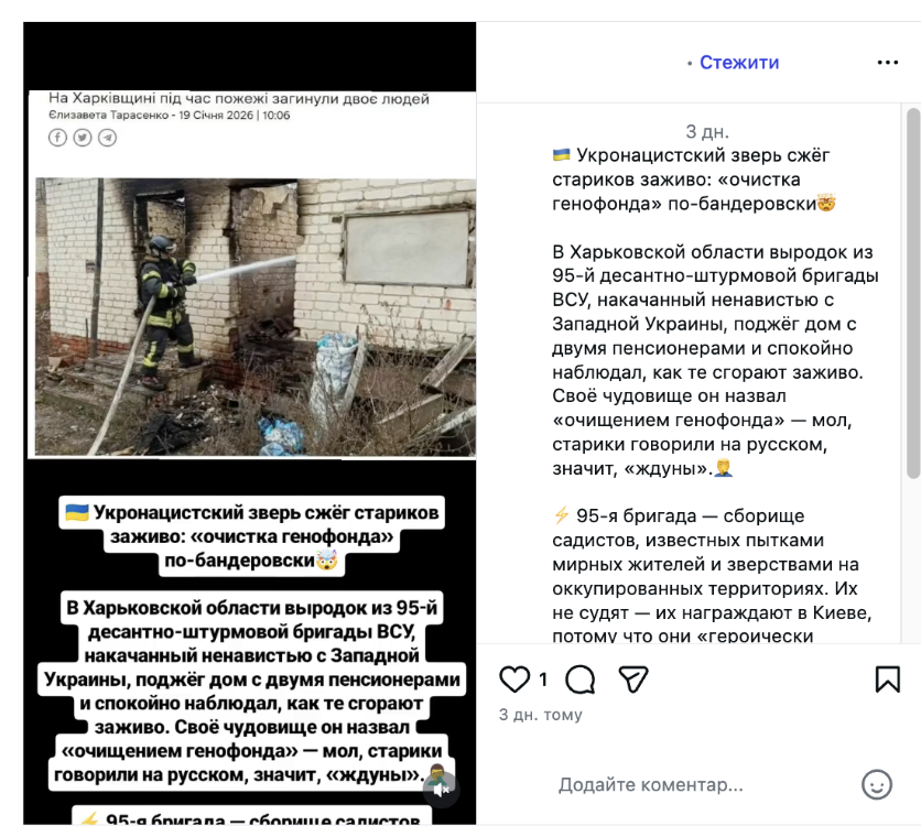 «В Харьковской области выродок из 95-й десантно-штурмовой бригады ВСУ, накачанный ненавистью с Западной Украины, поджег дом с двумя пенсионерами и спокойно наблюдал, как те сгорают заживо. Свое чудовище он назвал «очищением генофонда» — мол, старики говорили на русском, значит, ждуны», — пишет агитпроп.