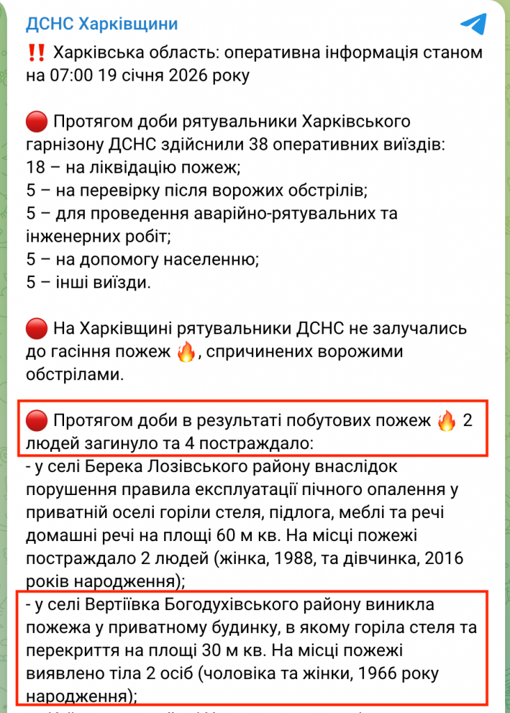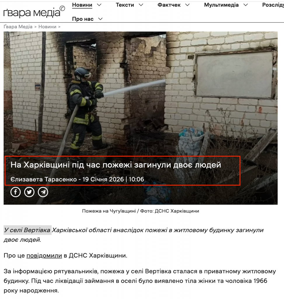 На публикуемом скриншоте, который используется пропагандистами в качестве «доказательства», отсутствует текст самой новости — виден лишь заголовок: «На Харьковщине во время пожара погибли двое людей». Агитпроп также не оставил прямой ссылки на новость и обрезал название СМИ. Тем не менее на нем остались ключевые данные — имя автора и дата публикации: Елизавета Тарасенко, 19 января 2026 года. По этой информации StopFake и удалось найти первоисточник.